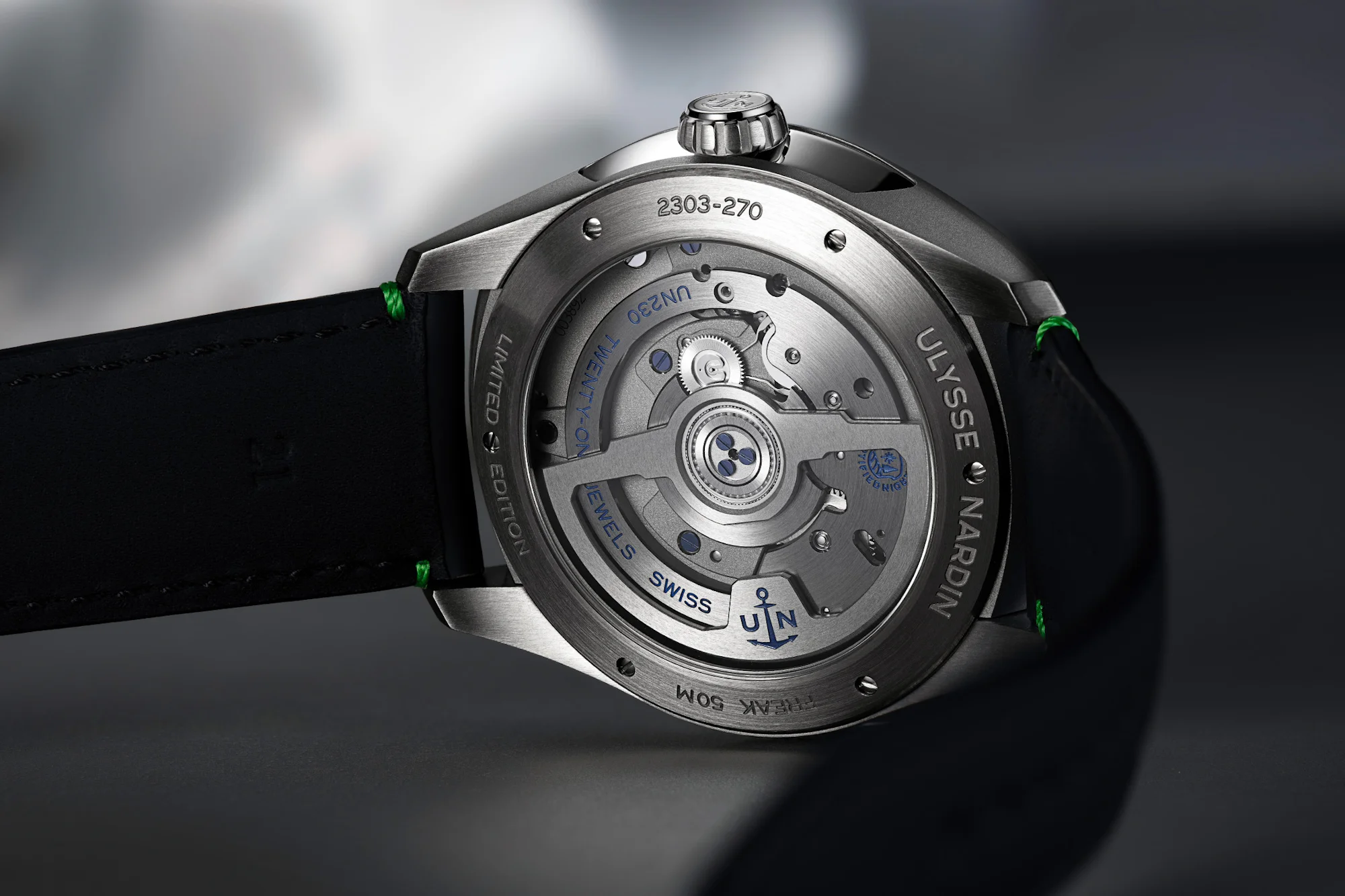 The disc combines traditional guilloche techniques with layers of vivid green enamel. Ulysse Nardin takes their enamel work so seriously that they acquired their own factory in Le Locle to produce these components in-house. The Bucherer Exclusive Freak X Enamel utilizes a titanium case and bezel paired with a black rubber strap highlighted by green stitching that complements the green dial.
