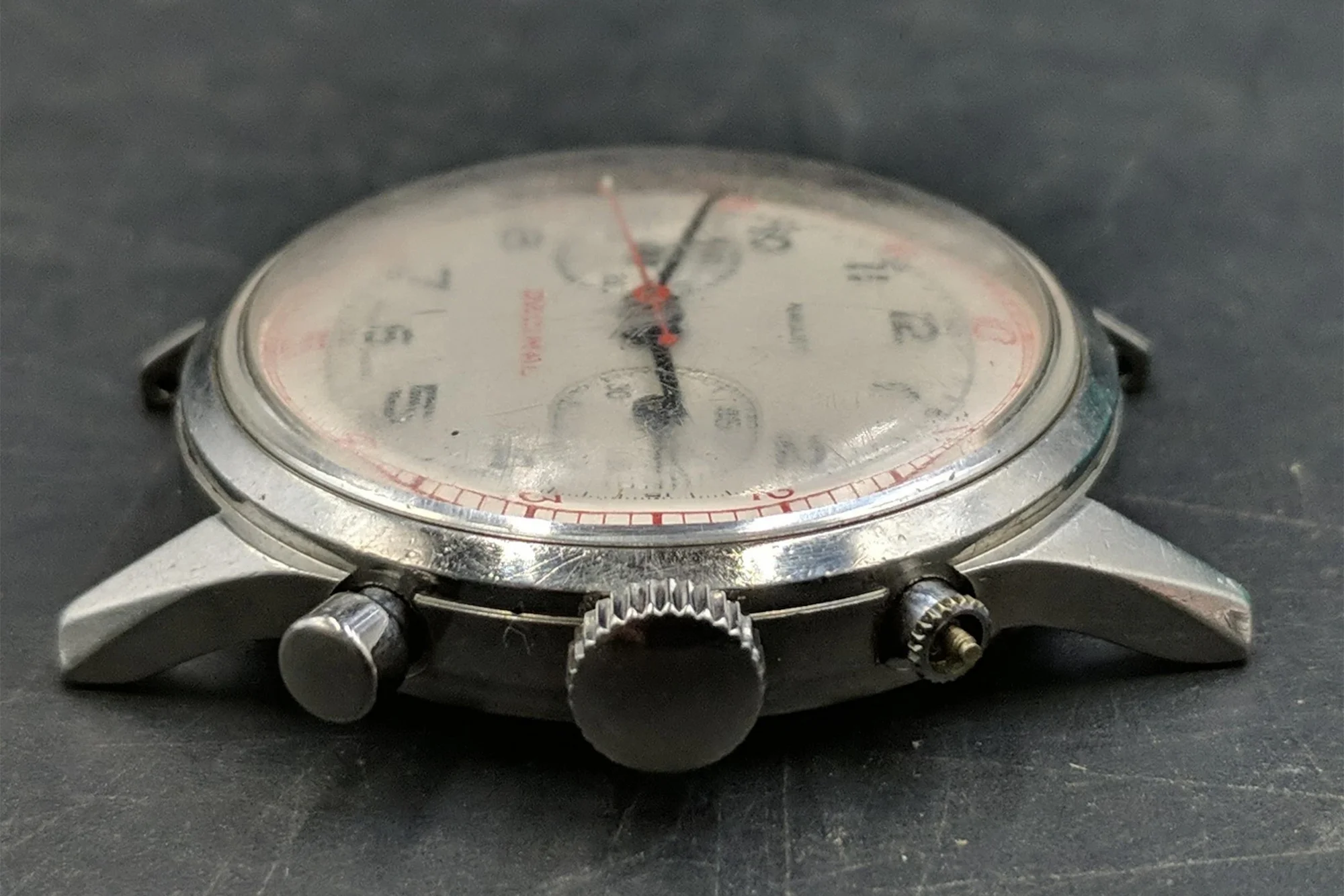 Powering this Decimal is the Excelsior Park cal. 4, otherwise known as the EP 4. These weren't as popular of an ébauche pick as Valjoux, for example, but collectors have come to really covet Excelsior Park calibers for their dependability, pusher feel, and interesting bridge layout. Gallet chronographs can be found around the internet, but this is a rare variant not only because of the decimal scale but because of the larger, more stout case. In the 40s, when Gallet began production of this watch, the Decimal was offered in a 36mm case with standard, non-pump pushers.