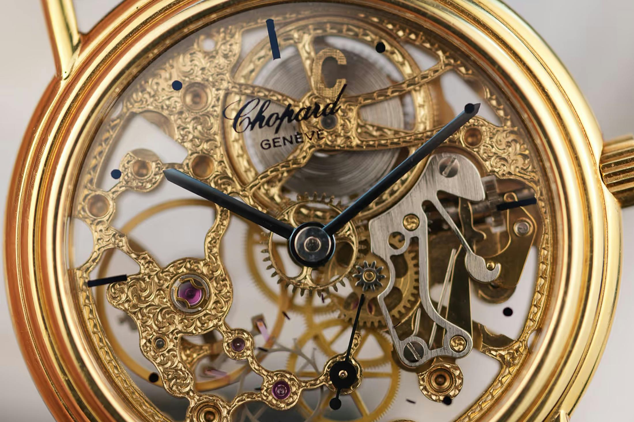 This period of Chopard's watch history is marked by third-party manufacture, well before Karl-Friedrich Scheufele, Co-President of Chopard, demanded the brand become a "true" watchmaker, leading to the development of the renowned caliber 1.96 in 1996. Also, before the watch industry was obsessed with the idea of creating everything "in-house." Armin Strom existed to create the world's most beautifully skeletonized movements — why not contract him to do exactly that?