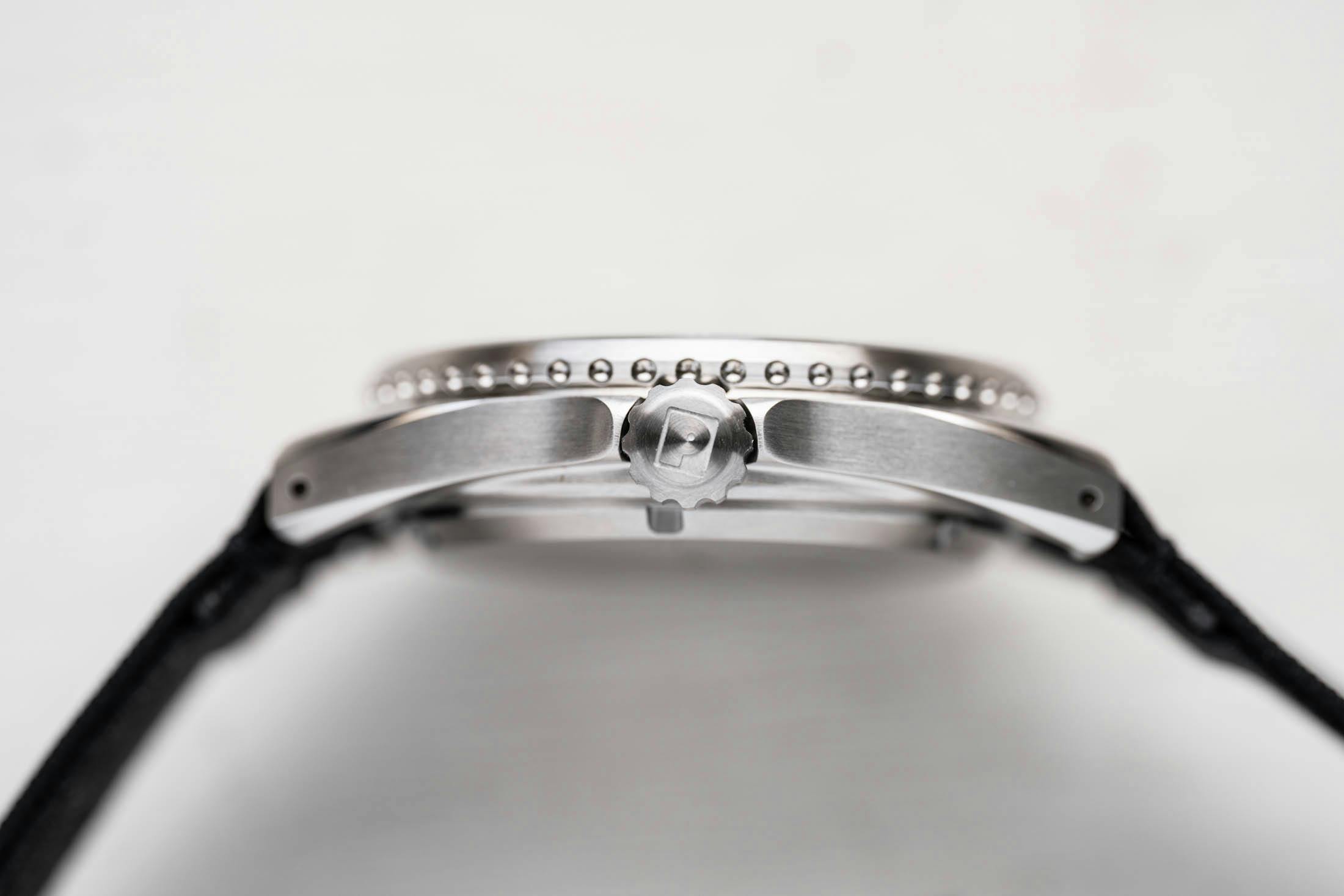 Gone are the ultra-sharp edges and the industrial screws on the side of the case, and this time, slightly softer beveling takes its place, and the steel case is streamlined to ensure the 300 meters of water resistance appropriate for a dive watch. Also adding to the softer silhouette is the 120-click unidirectional dive bezel, fitted with a curved sapphire ring with Super-LumiNova printed on its underside. The bezel action is quite nice for the price point, with a very crisp click action and very little back-and-forth play. It slightly overhangs the case, which, when paired with the indentations on the bezel, helps improve grip when it comes to gloves or wet, slippery hands. For a brand that's never designed any watch with a bezel before, I was honestly impressed.