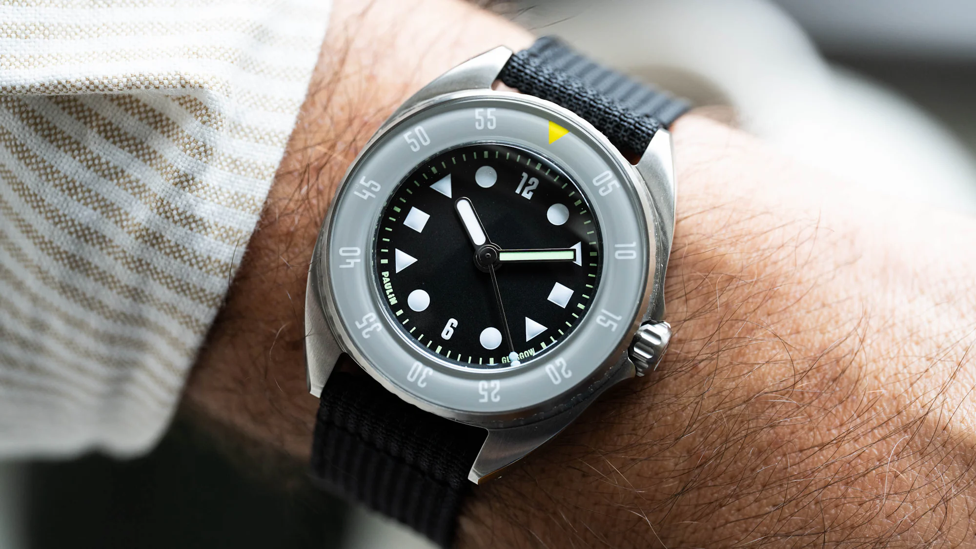 Paulin's logo and "Glasgow" are nicely integrated into the printed minutes track, while broad, rounded baton hands in two shades of Super-LumiNova provide maximum legibility. A lollipop seconds hand with a bright, contrasting colored tip is the cherry on top. I'm obsessed with this dial design, and I think that the balance achieved here between usability as a tool watch and visual interest is quite perfect. It's a good reminder that good designers possess the all-important quality of restraint.