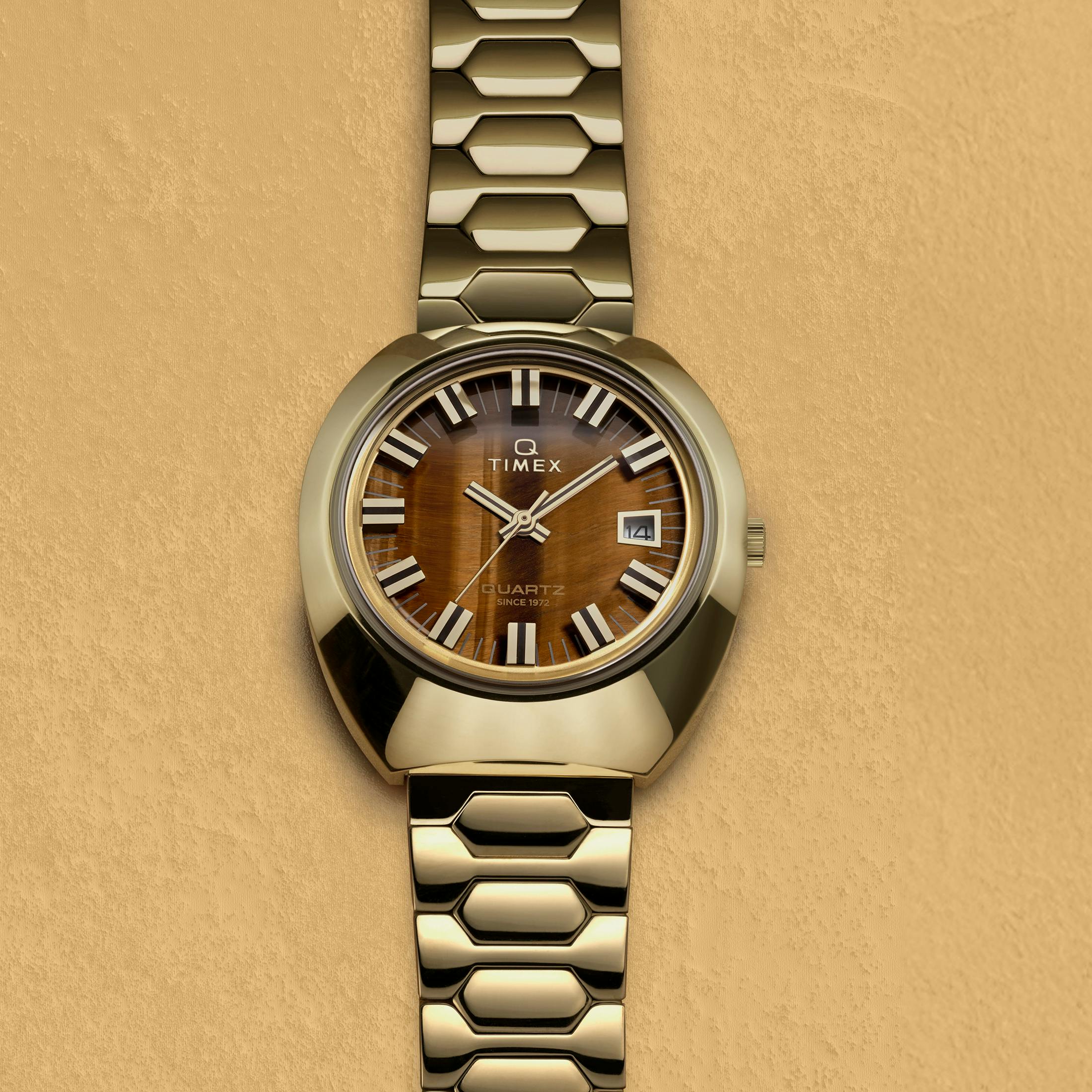 Next up are two new Q Timex 1972 "Time Machine" Reissues, in gold-toned and normal stainless steel, on bracelet, with very 70s domed cases measuring 40mm and with 50m of water resistance. The standard stainless steel version has a blue sunburst dial with silvered applied numerals and a white surround around the date window. That version costs $249, which feels like a bargain, but if you want a real value addition, the gold-toned version (with gold-toned indices) comes with a real Tiger's eye dial for only $30 more, for a total of $279.