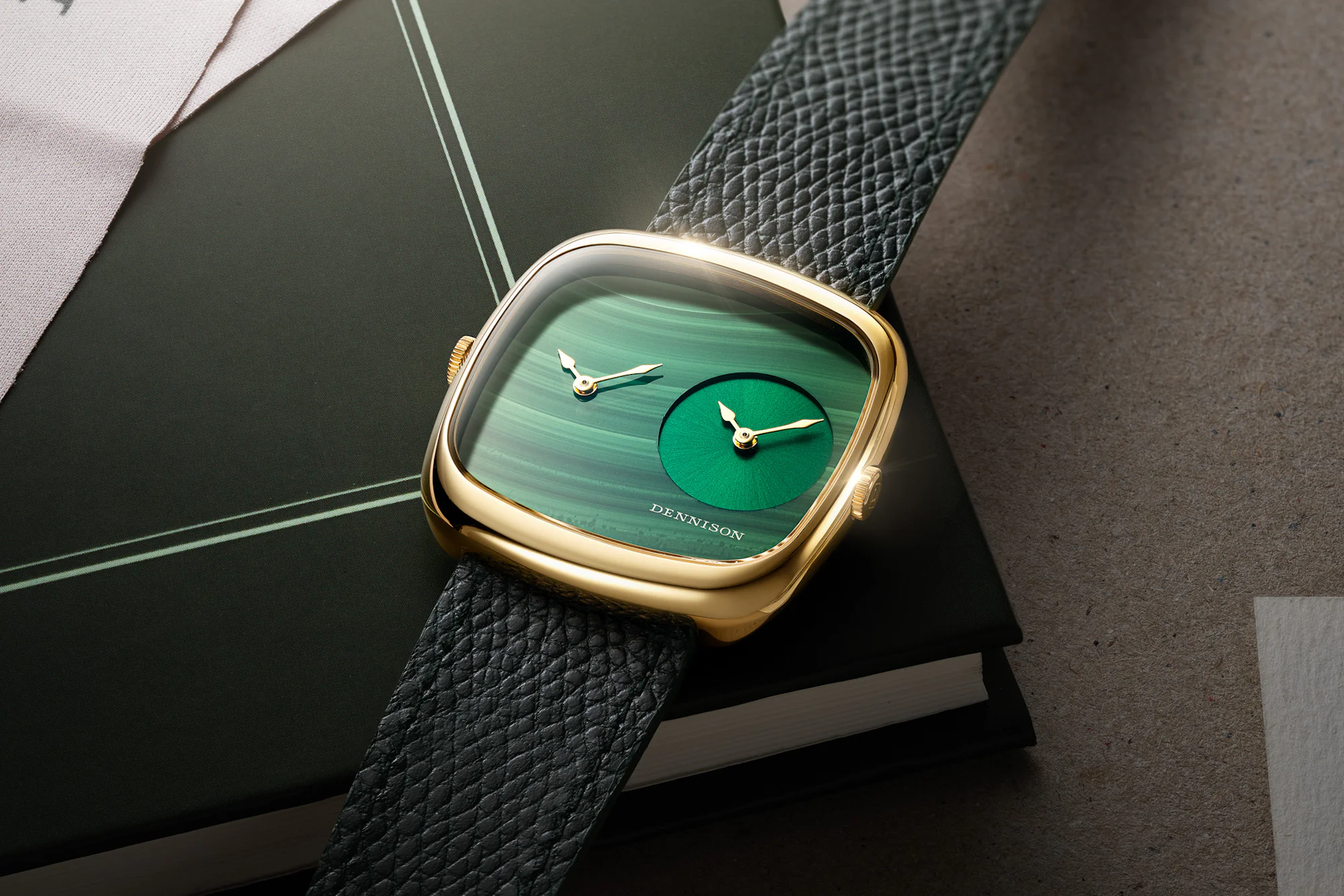 Now Dennison is leaning in hard to its '70s chic and form-first aesthetic with the ALD Dual Time. The new watch doubles down, literally, on the brand's recent offerings. The slightly larger rectangular case, in stainless steel or gold PVD, is 35.6 millimeters across, about 2 millimeters wider, with the same 37 millimeters in vertical length. That provides ample space to showcase the stone dials on display and enough room for two separate handsets, allowing the user to track and read two different time zones.
