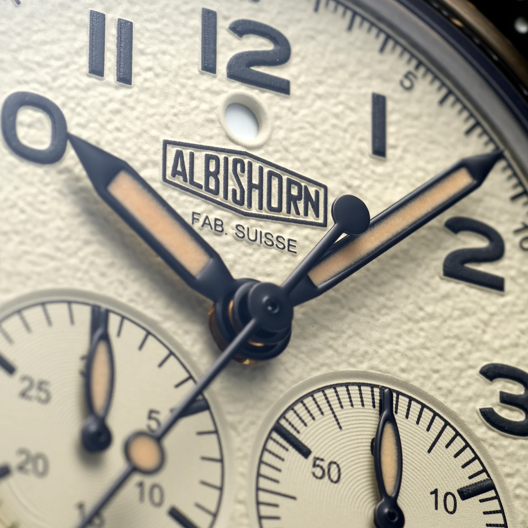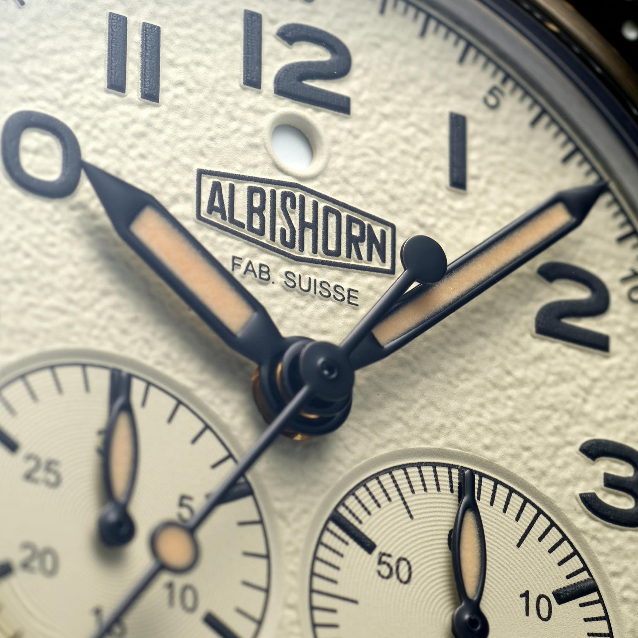 The rest of the watch is exactly why we like Albishorn. It's thoughtfully considered, with the right hues of beige, a nicely textured dial, and the small dot aperture at 12 o'clock to indicate when the chronograph is running.