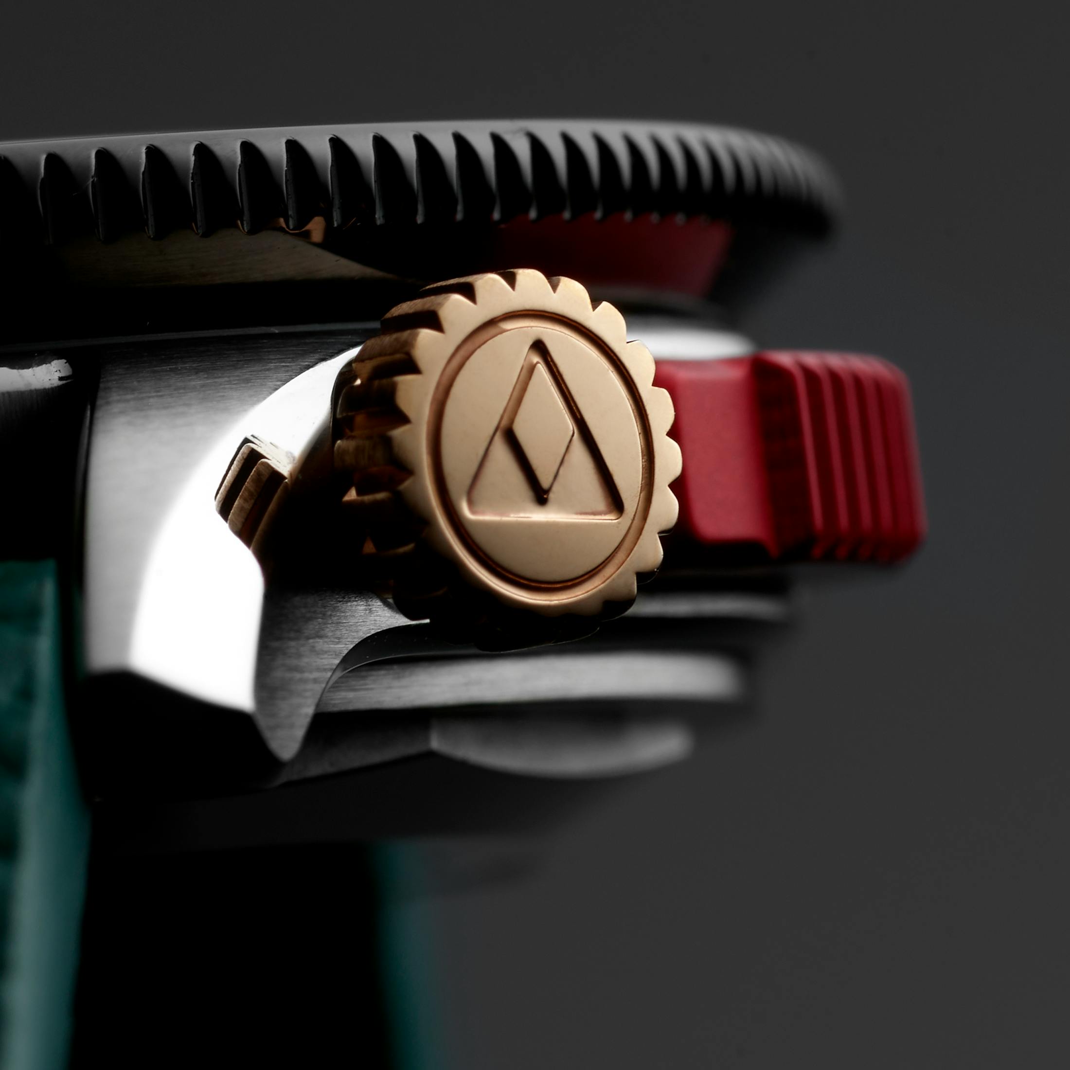 The stainless steel case, with a mix of brushed surfaces and polished chamfers, measures 39mm, with a rotating tension-fit bezel that overhangs the case to 41.7mm. The large red pusher sits at around 9:30 while the crown is at 10 o'clock. That, combined with the fact that the proprietary ALB02 M movement is based on the Valjoux 7750 architecture, means the subdials are in the lower portion of the dial (kind of like the Datograph). The case is reasonably thin due to the manual-winding architecture as well (12mm).