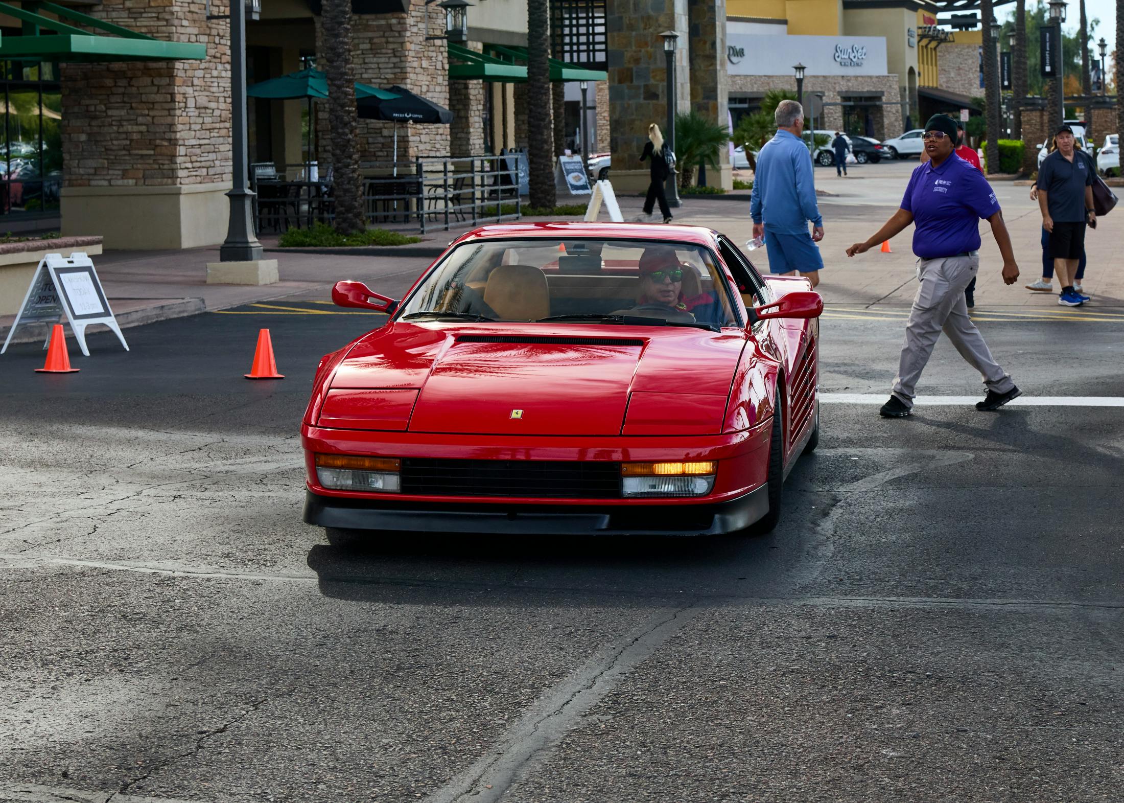 A Ferrari Testarossa arrives.